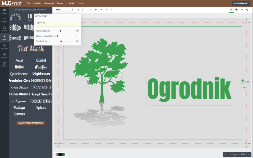 Zakładka tekst pozwala dodać tekst a następnie modyfikować jego wygląd